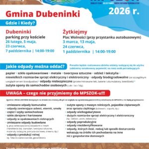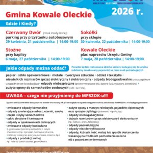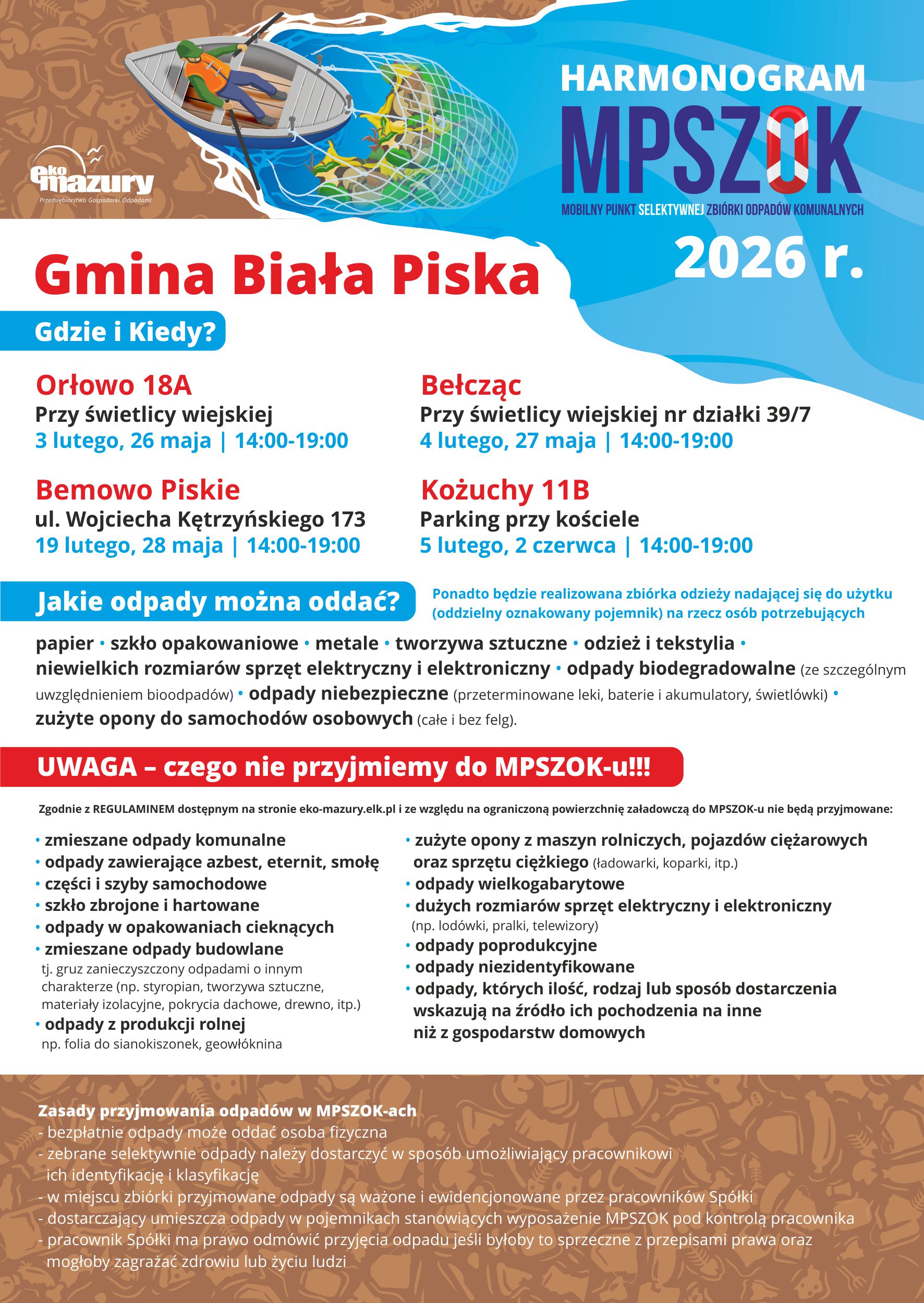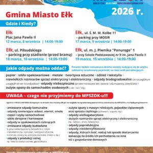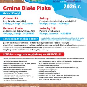 Po pozytywnym przyjęciu projektu przez mieszkańców w 2025 roku, Mobilne Punkty Selektywnej Zbiórki Odpadów Komunalnych (MPSZOK) ponownie wyruszają w teren! Tegoroczna edycja programu startuje już dziś – 3 lutego 2026 r. Pierwszy przystanek na trasie mobilnego PSZOK-u to Orłowo w Gminie Biała Piska, gdzie mieszkańcy będą mogli bezpłatnie oddać wyselekcjonowane odpady.